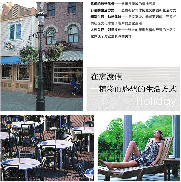在家度假,蓝色的小镇生活 Take vacation at home,blue leisure life 这是适合度假的小镇,这里有认清的沙滩、阳光、运动、音乐、酒吧。 这是适合居住的小镇,这里有咖啡、美酒、美食、书店、便利店。 这是适合养老的小镇,这里有清新的空气,休闲散步的林荫大道、一流的生活服务。 |